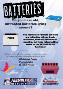 Do you have any unwanted batteries lying around – car,boat, motorbike etc. The Tasmanian Formula 500 Club are collecting old batteries to be recycled as part of their Beyond Blue Fundraiser. Batteries can be left at the main gate this coming Saturday, January 13. or at CJD Equipment in Prospect or TP Jones in Longford. All donations greatly appreciated.