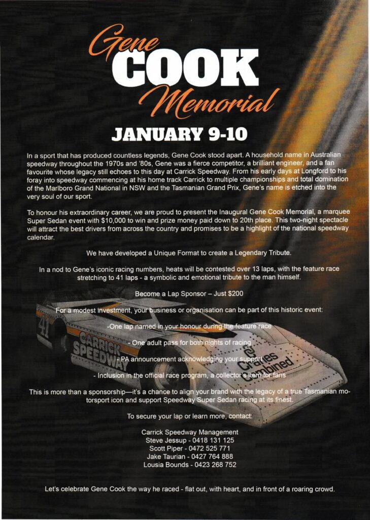 In a sport that has produced countless legends, Gene Cook stood apart. A household name in Australian speedway throughout the 1970s and ’80s, Gene was a fierce competitor, a brilliant engineer, and a fan favourite whose legacy still echoes to this day at Carrick Speedway. From his early days at Longford to his foray into speedway commencing at his home track Carrick to multiple championships and total domination of the Marlboro Grand National in NSW and the Tasmanian Grand Prix, Gene’s name is etched into the very soul of our sport.
