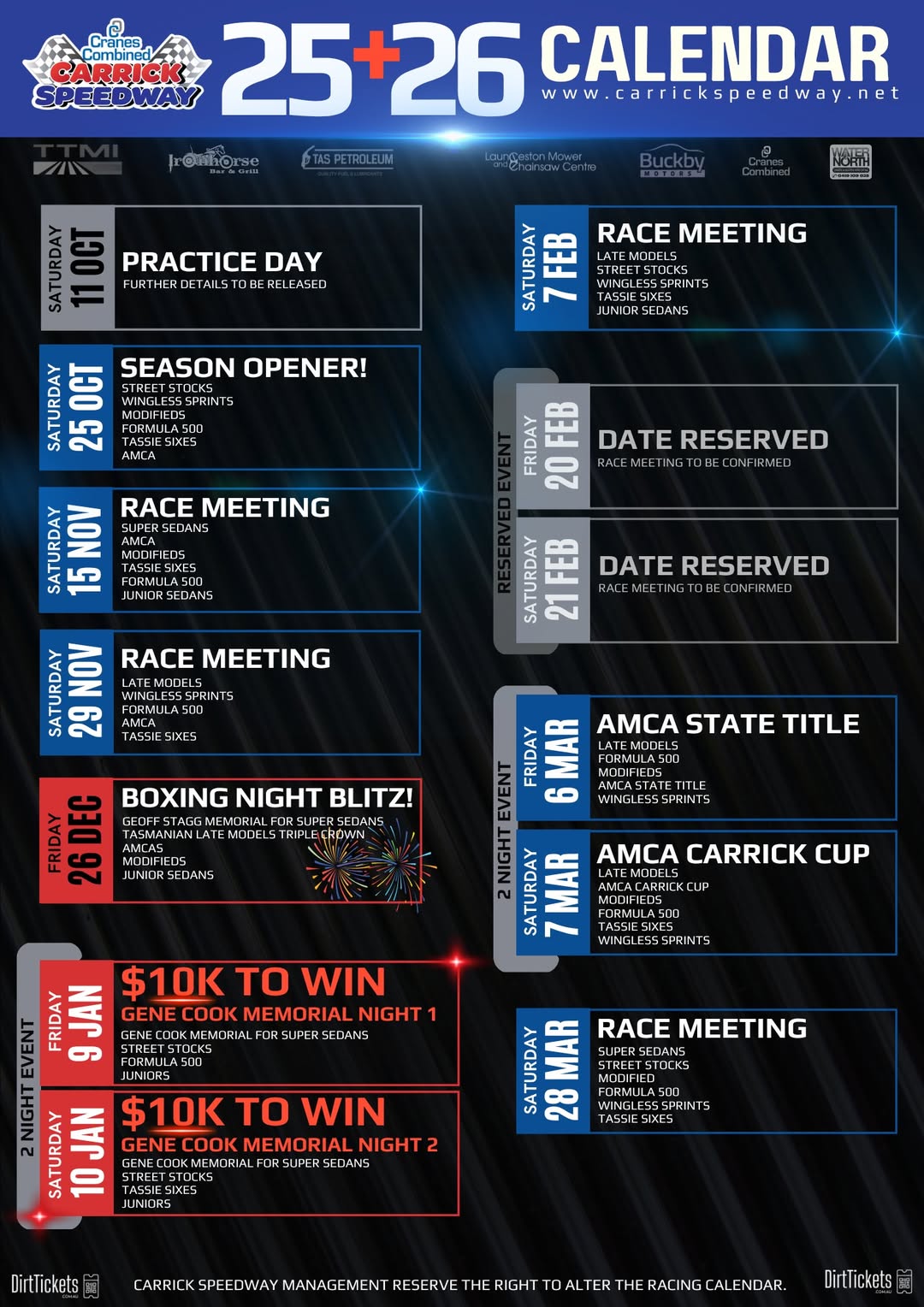 TasHydraulics Season Opener 𝗦𝗮𝘁𝘂𝗿𝗱𝗮𝘆 𝟮𝟱𝘁𝗵 𝗢𝗰𝘁𝗼𝗯𝗲𝗿 𝟮𝟬𝟮𝟱 Thanks to the event sponsor TasHydraulics https://www.tashydraulics.com.au ➜ 𝗘𝗩𝗘𝗡𝗧 𝗧𝗜𝗠𝗘𝗦: Gates Open – 12 noon Racing From – 4pm ➜ 𝗖𝗢𝗠𝗣𝗘𝗧𝗜𝗧𝗢𝗥 𝗡𝗢𝗠𝗜𝗡𝗔𝗧𝗜𝗢𝗡𝗦: https://www.myracepass.com/tracks/1274/registrations ➜ 𝗗𝗜𝗩𝗜𝗦𝗜𝗢𝗡𝗦 𝗦𝗖𝗛𝗘𝗗𝗨𝗟𝗘𝗗: Modified Sedans Read More …