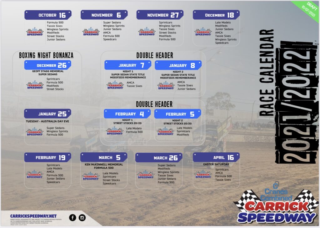 AMCA, Tassie Sixes, Wingless Sprints, Modifieds, Street Stocks, Junior Sedans.