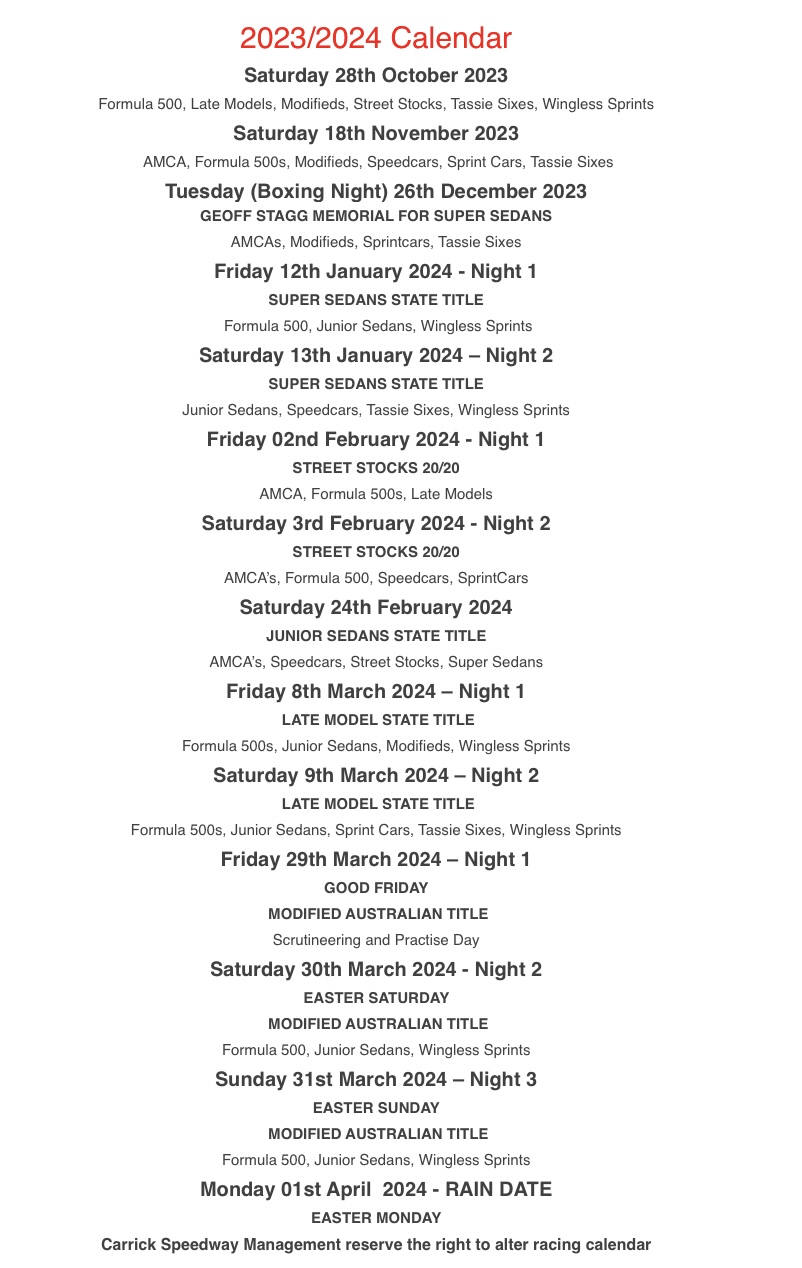 OUR BIGGEST NIGHT OF THE SEASON! Like and share to win a family pass on Carrick Speedway Face Book!! Carrick Speedway Facebook Cranes Combined Boxing Day Blitz! – Tuesday 26th December 2023 WHATS ON? Sprintcars Read More …