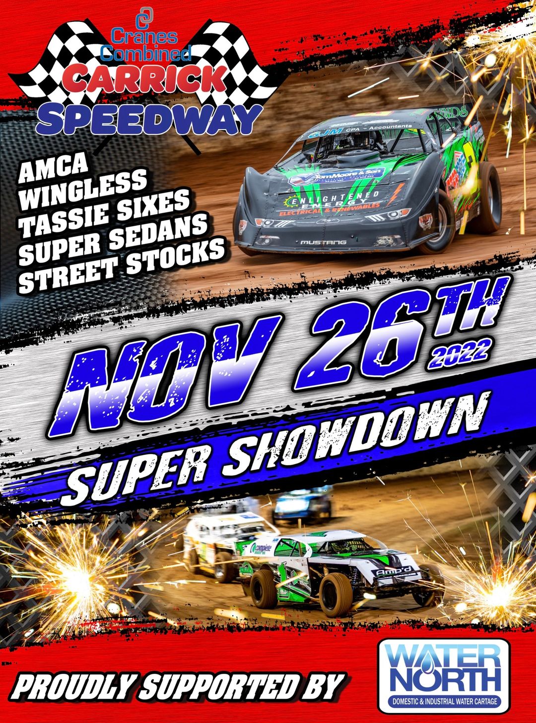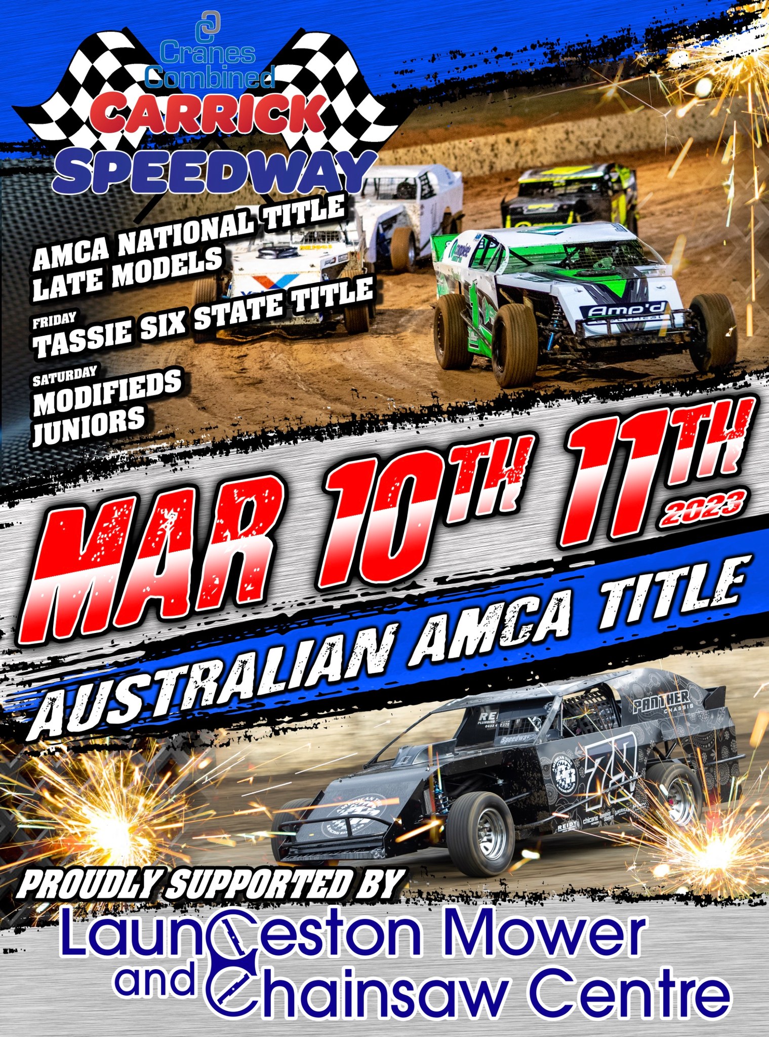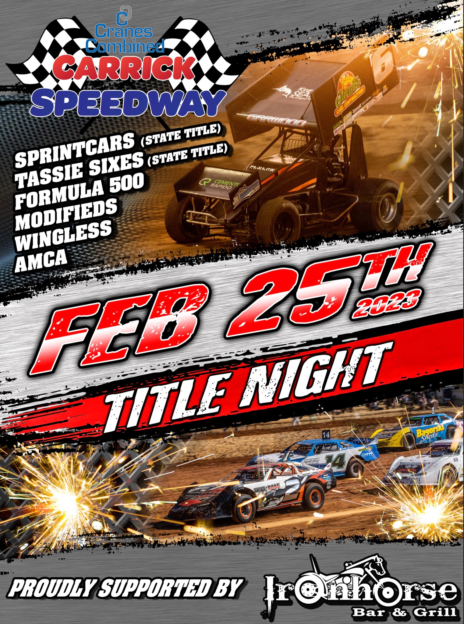 Ironhorse Showdown thanks to Iron Horse Bar & Grill – Saturday 18th November 2023 Divisions Scheduled:Sprint Cars, AMCA, Formula 500s, Modifieds, Junior Sedans, Tassie Sixes. Important Times:Competitors – 1pmSpectators – 2pmRacing Starts – 5pm Gate Prices:Adults – $32Concession – $28Students Read More …