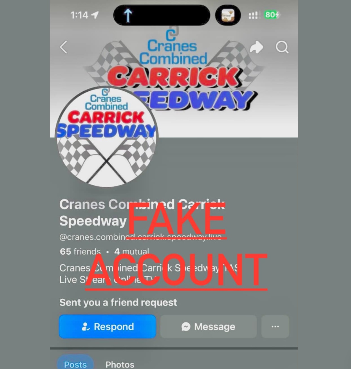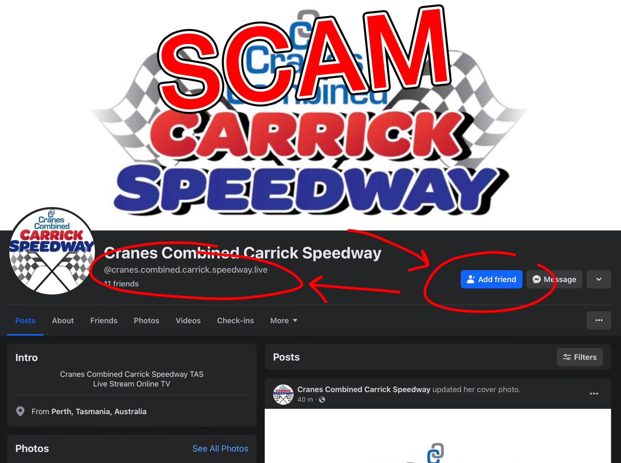 The official Cranes Combined Carrick Speedway page is a page. Not a person, you cant add us as a friend, you can only like. If you see this page and it suggests being ‘friends’, it’s a scam Read More …