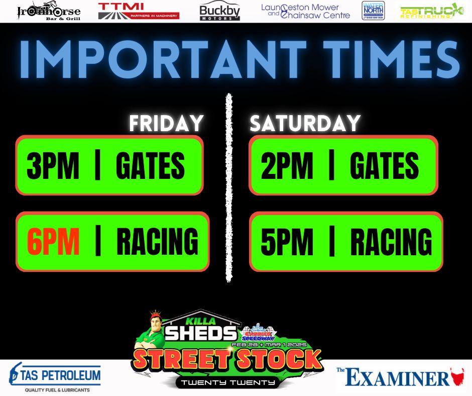 The Examiner & KillaSheds Street Stock 20/20 Night 1 Tas Petroleum & KillaSheds Street Stock 20/20 Night 2 Important times for this weekends activities! Please take note of the Friday night times.