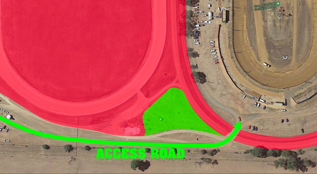 Cranes Combined Carrick Speedway is surrounded by facilities used for the pacing club, including trotting tracks that circle the complex. While we understand parking can be difficult on the big shows, under no circumstances are vehicles allowed to drive on or park on the trotting tracks, as they are causing significant damage to the surface. The overflow car park has been marked out in green, and any vehicle found to be parking in the red zone will be asked to move, or if fails to do so, may be towed.